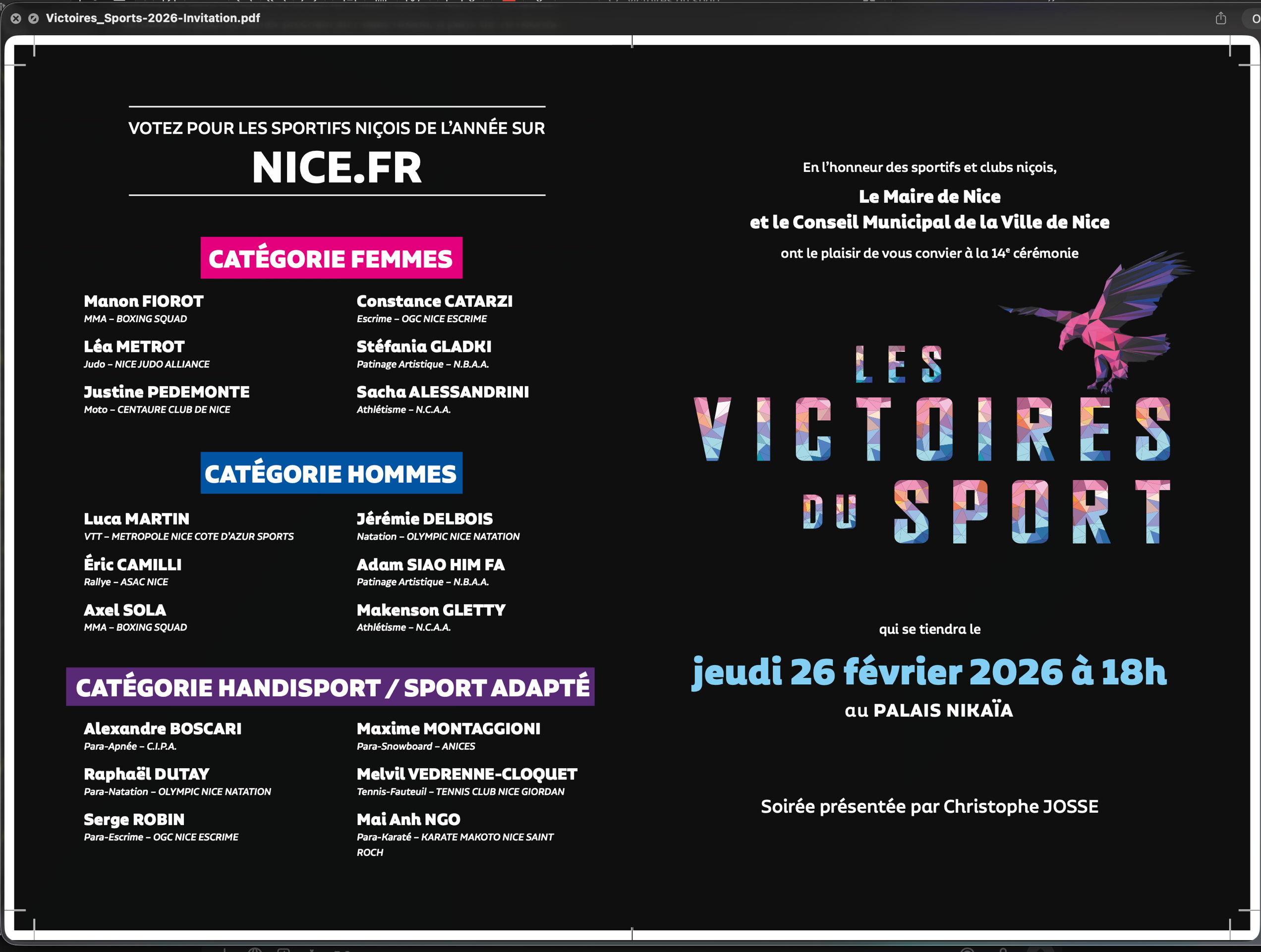 Nous remercions la Ville de Nice pour l’organisation de cet événement et pour l’attention portée aux sportifs et à leurs encadrants.